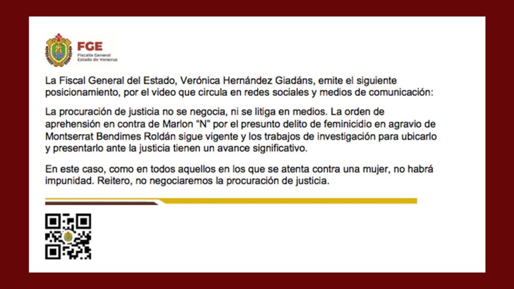 “Hola, mi nombre es Marlon Botas Fuentes y soy requerido por la Fiscalía de Veracruz por el delito de feminicidio, señalado de perpetrarlo en contra de Monserrat Bendimes Roldán, cabe destacar que lo que la fiscalía señala fue un accidente y no es nada cercano a lo que se dice en redes o en el expediente”, mencionó.