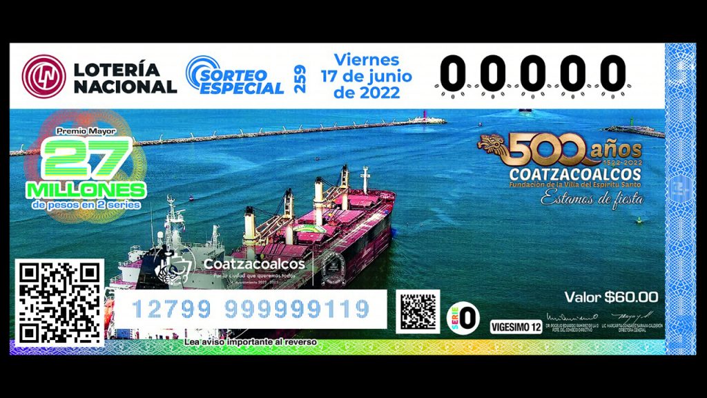 El billete de la lotería promueve, a través de fotografías, las actividades portuarias, y sitios emblemáticos de la ciudad, entre ellos el Paseo de Las Escolleras, el Malecón Costero, el Hemiciclo a los Niños Héroes, la playa, los atardeceres y la navegación de barcos en el río y puerto de Coatzacoalcos.
