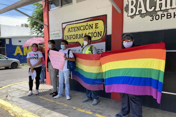 Alumnos y padres de familia de una escuela ubicada en el fraccionamiento Río Medio e integrantes de la comunidad LGBTTIQ+ de varias asociaciones civiles se manifestaron pacíficamente en las instalaciones del Instituto Olmeca para clausurar simbólicamente la escuela en protesta porque el pasado 12 de agosto despidieron al maestro Alejandro Salazar por usar tenis con los colores del arcoiris que representa a la bandera gay.
