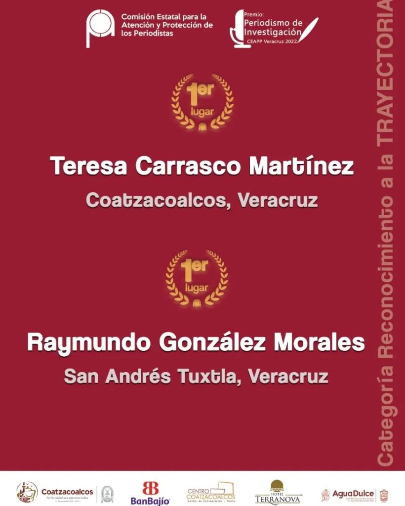 Finalmente, el Jurado determinó que la periodista Teresa Carrasco Martínez de Coatzacoalcos, así como el periodista Raymundo González Morales de San Andrés Tuxtla fueran merecedores del Premio en la categoría Reconocimiento a la Trayectoria.