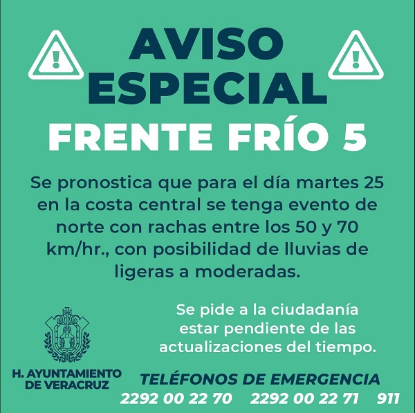 El gobierno municipal de Veracruz, a través de la Unidad de Protección Civil, difundió el aviso especial por la entrada del Frente Frío no. 5 en el puerto de Veracruz,.