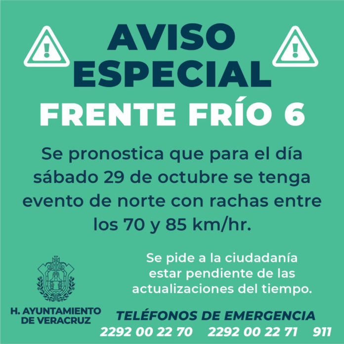 El gobierno municipal de Veracruz, a través de la Unidad de Protección Civil, difunde un aviso especial sobre la entrada al puerto de Veracruz del Frente Frío no. 6 para el día de mañana, sábado 29 de octubre, el cual de acuerdo a los pronósticos dejará vientos del norte con rachas entre los 70 a 85 kilómetros por hora.