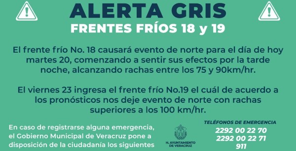 Veracruz, Ver.- El gobierno municipal de Veracruz, a través de la Unidad de Protección Civil, informa sobre la Alerta Gris por los Frentes Fríos no. 18 y 19 en el puerto de Veracruz.