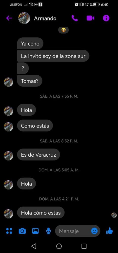 Bajo el título, “Yo solo quería un servicio de taxi, tengan cuidado chicas #BocadelRío”, la denunciante acompaño su publicación con capturas de pantalla de su celular, donde un sujeto de nombre Armando le hacia diversas insinuaciones.