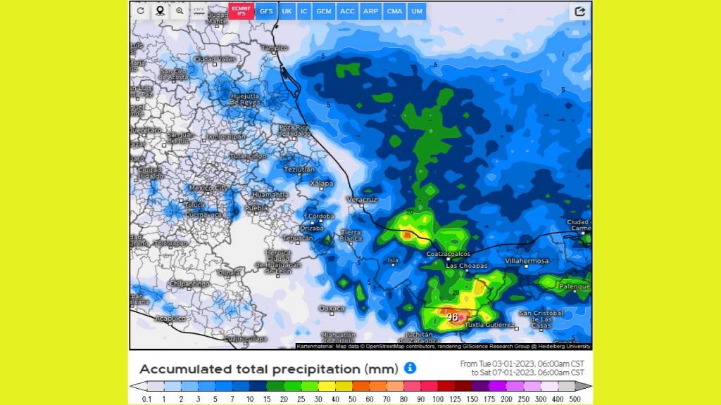 • Miércoles 04 de enero: Aumento de nublados en zonas montañosas y sur de la región, donde se prevén lloviznas y lluvias de 5.1 a 25 mm, con los mayores acumulados en Los Tuxtlas y cuencas de los ríos Coatzacoalcos y Tonalá. Posibles nieblas en porciones de montaña.