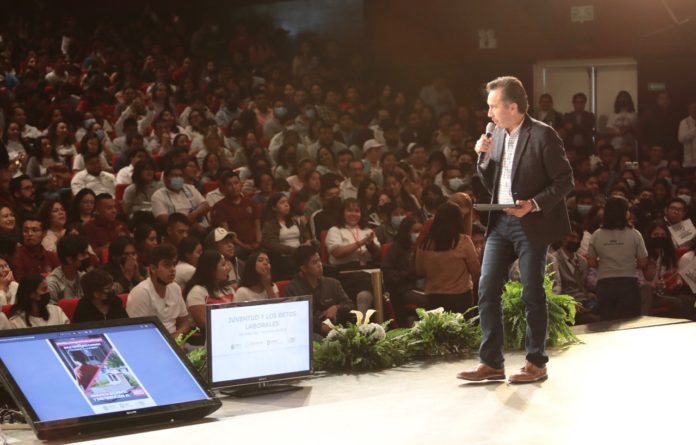 El mandatario acompañó a las secretarías de Trabajo, Previsión Social del gobierno Federal, Luisa María Alcalde Luján y de Veracruz, Dorheny Calletano García, quienes dialogaron sobre la empleabilidad de la juventud y los retos a superar.