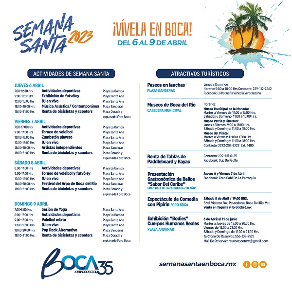 Para conocer a detalle el programa “Semana Santa 2023”, lo pueden hacer a través de la página oficial www.SemanaSantaenBoca.mx así como mediante las redes sociales oficiales del Ayuntamiento: www.facebook.com/BocaLoMejorDeVeracruz, Twitter: @_BocadelRio e Instagram: @bocadelrio.ver.