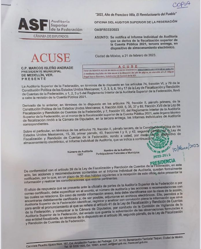 “Derivado del informe individual de auditoría y de conformidad con el artículo 39 de la Ley de Fiscalización y Rendición de Cuentas de la Federación, el municipio de Medellín de Bravo fue formalmente notificado por la Auditoria Superior de la Federación (ASF), sobre la fiscalización de la cuenta pública 2021 mediante la Promoción de: Responsabilidad Administrativa Sancionatoria”.