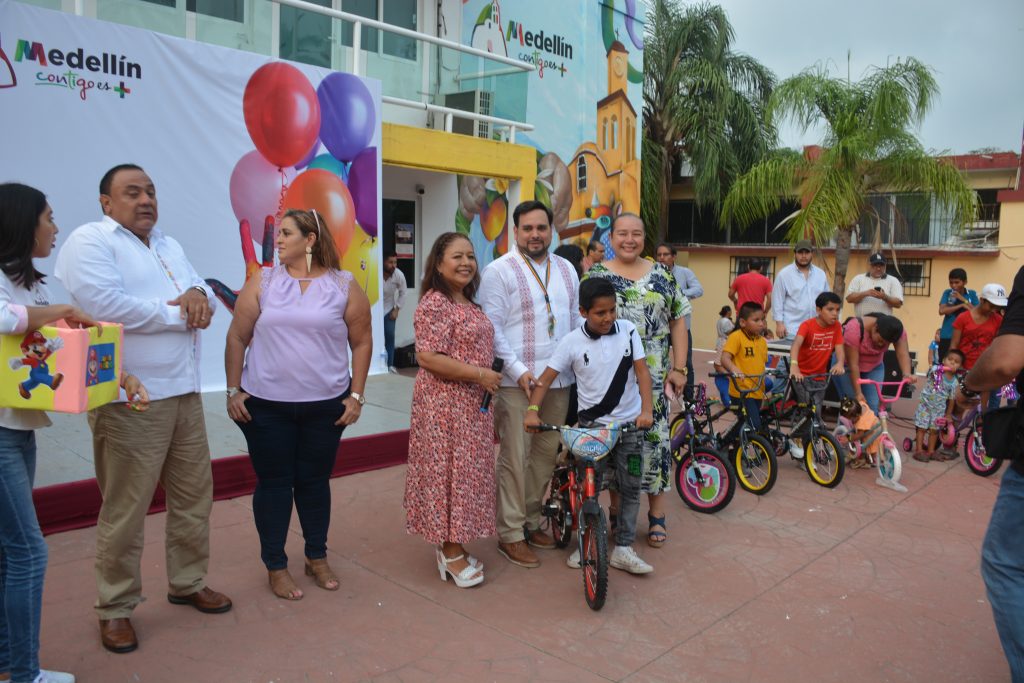 El alcalde de Medellín de Bravo, Marcos Isleño Andrade les adelantó sus regalos a los niños medellinenses por el día del niño y este fin de semana tuvo dos eventos, uno en Palacio Municipal y otro en Puente Moreno, donde regaló bicicletas, muñecas, soldaditos, unicornios y otros obsequios y de paso reactivó la economía de los comerciantes que colocaron sus puestos en el parque Nicolás Bravo, pues los padres de familia e hijos compraron nieves, esquites, hot- dogs, hamburguesas, tortas y fritangas.