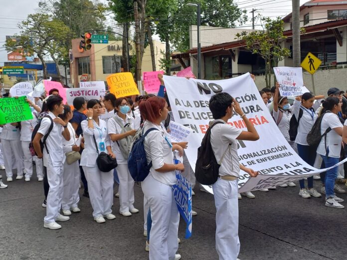 Enfermeras y estudiantes de enfermería marcharon del teatro del Estado General Ignacio de la Llave hacia la plaza Sebastián Lerdo de Tejada para manifestar su inconformidad por la pretensión de desaparecer la licenciatura y que esta sea una carrera técnica, además de tener mejorías salariales para quienes laboran en los centros hospitalarios.