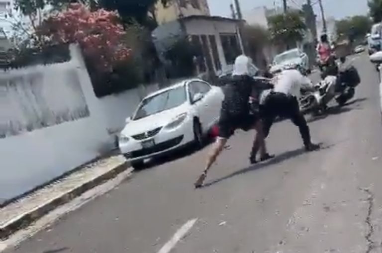 En otro video se observa cuando el individuo golpea al agente de tránsito. La motocicleta del agente vial luce tirada en el pavimento.