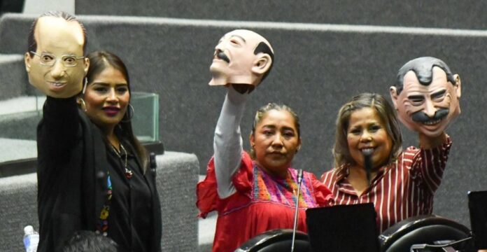Cuando habían transcurrido unas cinco horas de la comparecencia de Rogelio Ramírez de la O, titular de la Secretaría de Hacienda, legisladores de Morena comenzaron a repartir las máscaras de los expresidentes e, incluso, dejaron algunas en sus curules.