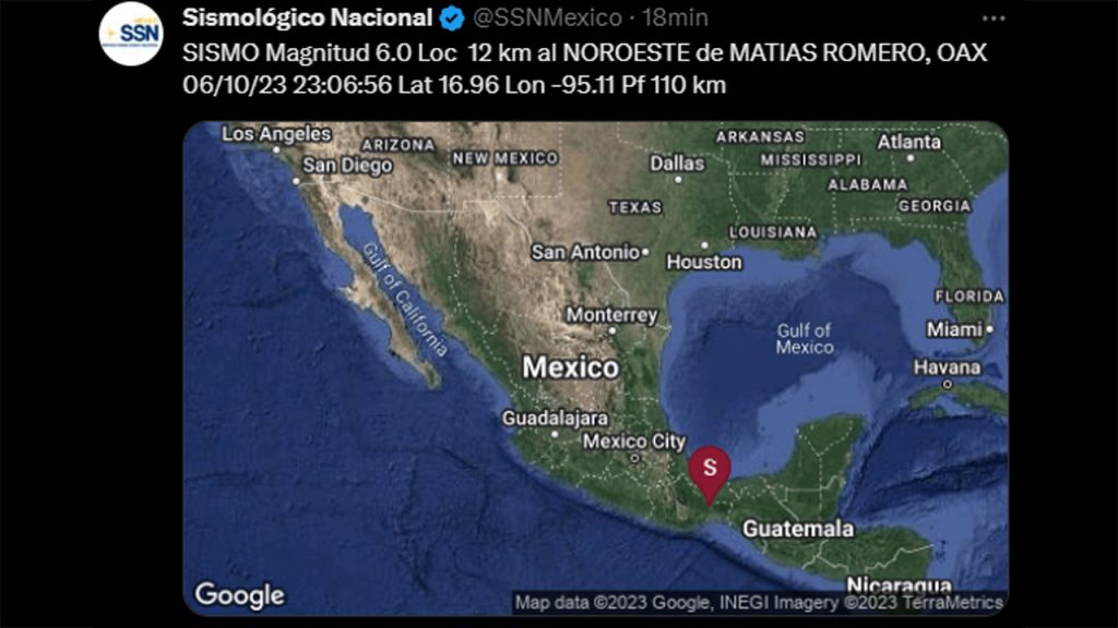 “Sismo Magnitud 6.0 Loc 12 km al noroeste de Matías Romero, Oax 06/10/23 23:06:56 Lat 16.96 Lon -95.11 Pf 110 km” escrbió el Servicio Sismológico Nacional en su cuenta de twitter X.
