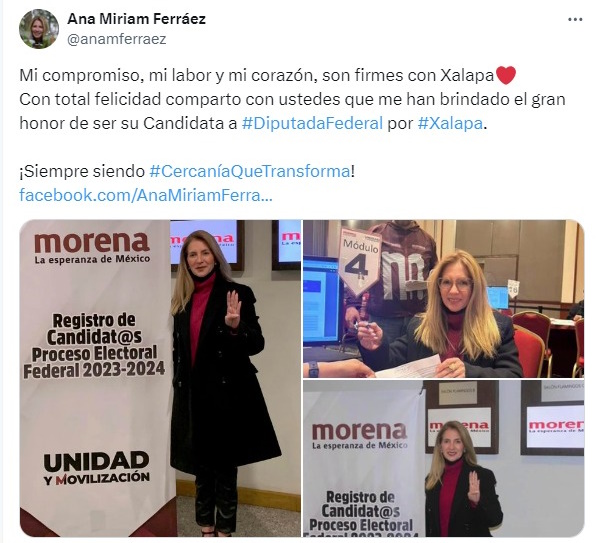 La diputada local Ana Miriam Ferráez Centeno será la candidata a la diputación federal por la alianza Morena, PT- PVEM en el distrito de Xalapa. Ferráez le tumbó la candidatura a Rafael Hernández Villalpando, quien ya lo había designado el comité ejecutivo nacional de Morena como candidato a la diputación federal por el distrito de Xalapa, pero fue sustituido por Ana Miriam.