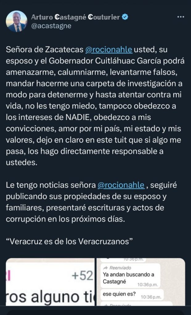 En su cuenta de X, antes Twitter, Castagné escribió hoy: “Señora de Zacatecas @rocionahle usted, su esposo y el gobernador Cuitláhuac García podrá amenazarme, calumniarme, levantarme falsos, mandar hacerme una carpeta de investigación a modo para detenerme y hasta atentar contra mi vida, no les tengo miedo”.