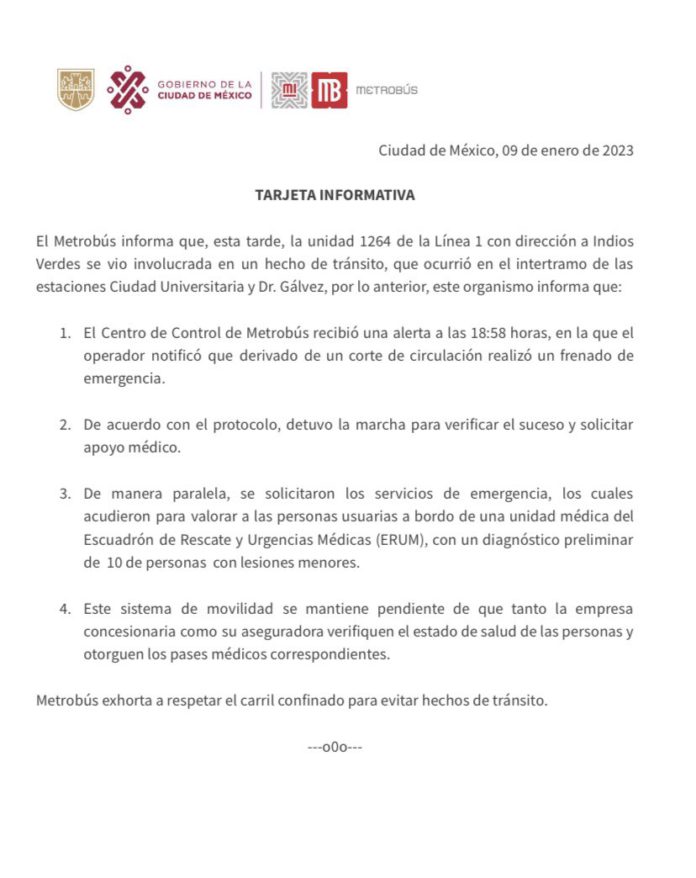 Para finalizar el comunicado, el metrobús exhortó a los conductores respetar el carril exclusivo de este transporte, para evitar accidentes viales.