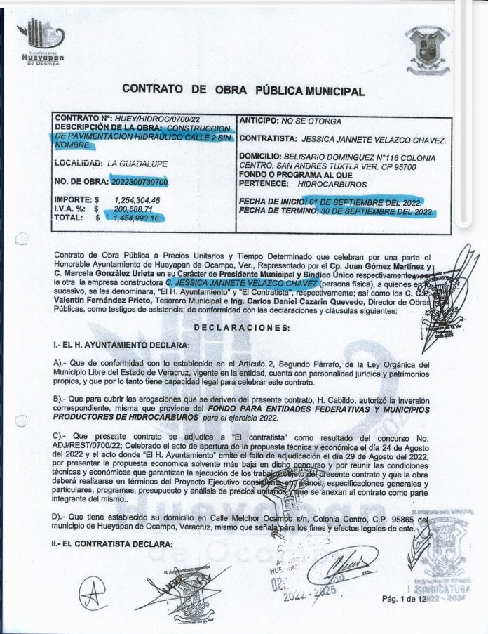 El alcalde de Hueyapan de Ocampo, papá de Juan Javier Gómez Cazarín, otorgó contratos por más de siete millones y medio de pesos a Jessica Yannete Velazco para la pavimentación con concreto hidráulico y a Andrés Antemate Pucheta para la construcción de dormitorios y pavimentación con concreto hidráulico por un monto de millón y medio de pesos, según el documento.