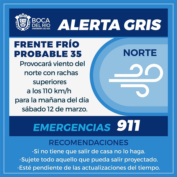 Boca del Río, Ver.- Ante la Alerta Gris emitida por las autoridades estatales por el ingreso del Frente Frío (posible No. 35), Protección Civil de Boca del Río informó que se pronostica vientos del norte con posibles rachas máximas de 110 km/h para este sábado 12 de marzo.