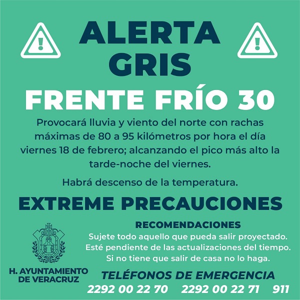Veracruz, Ver.- El gobierno municipal de Veracruz, a través de la Unidad de Protección Civil, informa sobre la Alerta Gris por la entrada del Frente Frío No. 30, emitida por las autoridades estatales, el cual provocará lluvia y viento del norte con rachas de 80 y 95 kilómetros por hora, el viernes 18 de febrero, alcanzando su pico más alto por la tarde–noche de este día, con un descenso de la temperatura.
