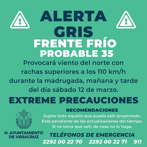 Veracruz, Ver.- El gobierno municipal de Veracruz, a través de la Unidad de Protección Civil, informa sobre la Alerta Gris por la entrada del Frente Frío (posible No. 35), emitida por las autoridades estatales, el cual provocará viento del norte con rachas máximas superiores a 110 kilómetros por hora en la costa para la mañana del día sábado 12 de marzo.