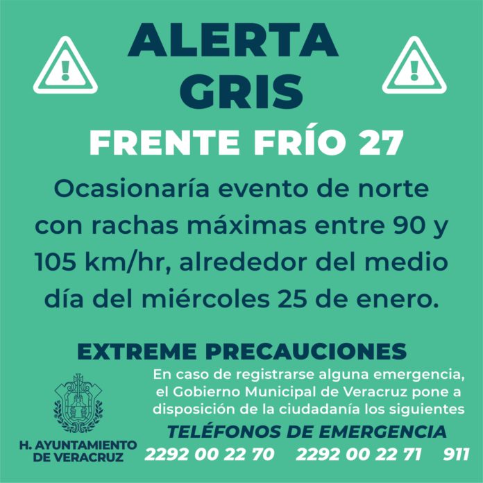 Veracruz, Ver., 24 de enero de 2023.- El gobierno municipal de Veracruz, a través de la Unidad de Protección Civil, informa sobre la Alerta Gris por el Frente Frío no. 27 en el puerto de Veracruz para el día de mañana miércoles 25 de enero.
