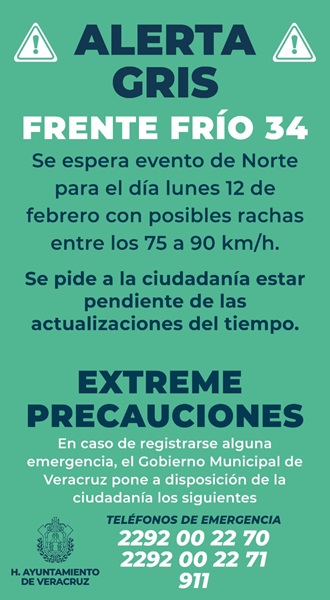 Veracruz, Ver.- El Gobierno Municipal de Veracruz, a través de la Unidad de Protección Civil, informa sobre la Alerta Gris por la entrada del Frente Frío No.34 al puerto de Veracruz.