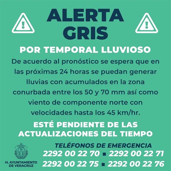 Veracruz, Ver., 11 de septiembre de 2022.- El Gobierno Municipal de Veracruz, a través de la Unidad de Protección Civil, informa sobre la Alerta Gris por temporal lluvioso, emitida por la Secretaría de Protección Civil.