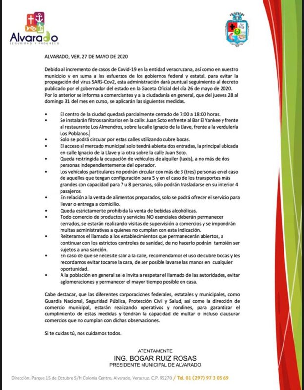El Ayuntamiento de Alvarado informó, a través de un comunicado, sobre las medidas de prevención para evitar la aglomeración de personas y con ello el contagio de Covid-19.