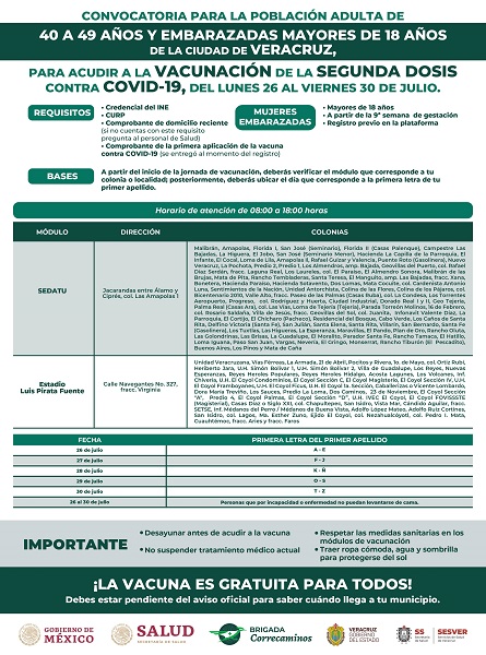 Del lunes 26 al viernes 30 de julio se aplicará la segunda dosis de la vacuna contra el COVID-19 a las personas de 40 a 49 años de edad en este municipio porteño.