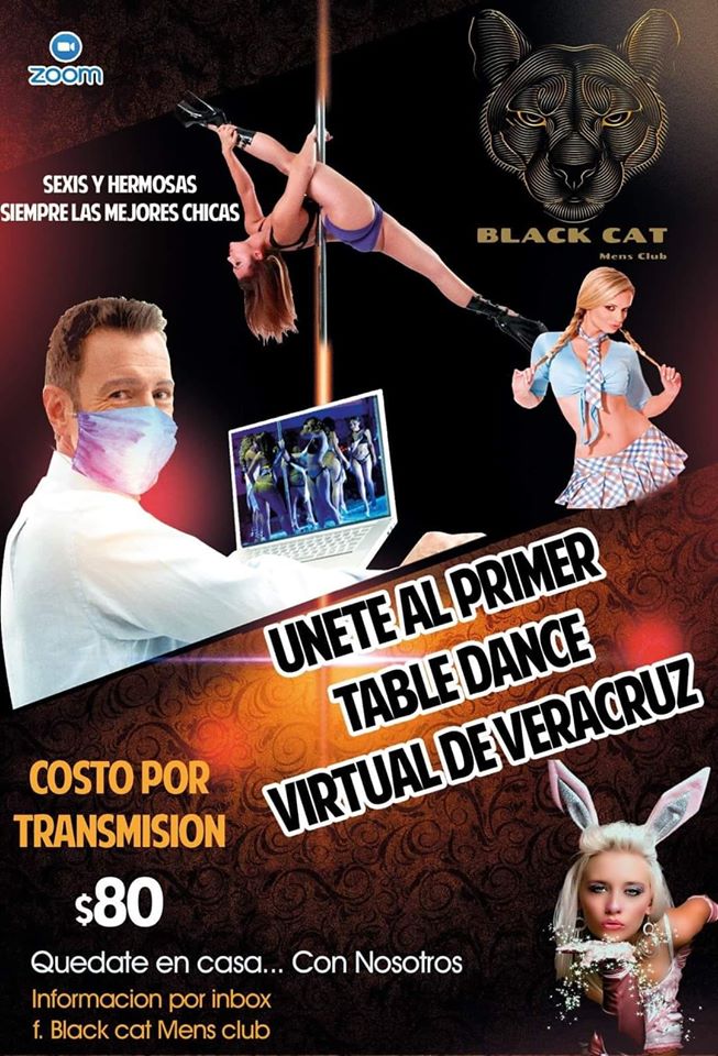 En Xalapa, el table dance Black Cat Men’s Club promociona un show a través de la plataforma Zoom. El anuncio ha tenido buena respuesta por parte de los caballeros que están interesados en participar como espectadores en el espectáculo virtual.