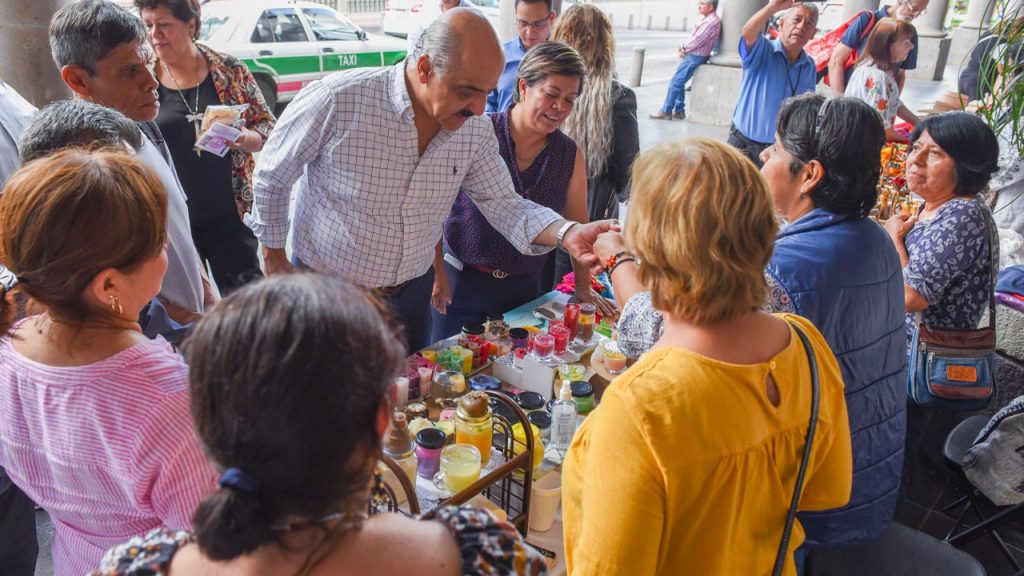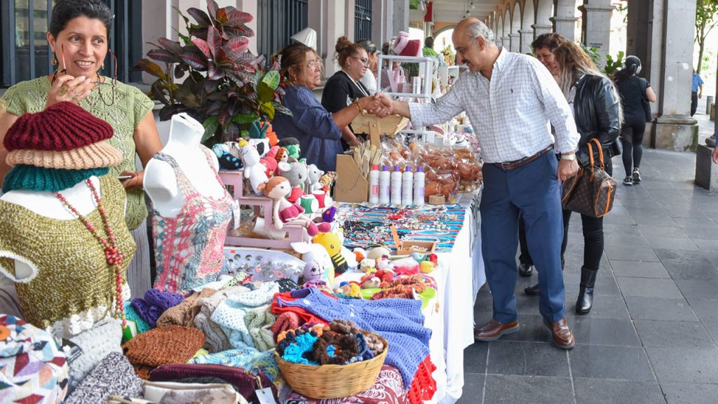 Xalapa, Ver.- El alcalde Ricardo Ahued Bardahuil saludó a emprendedoras y emprendedores de una expo-venta de productos locales en el pasillo exterior de Palacio Municipal, misma que concluye este miércoles.