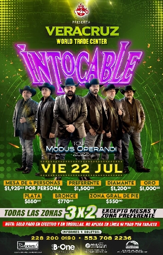 Intocable en Veracruz este 22 de Julio WTC, en Xalapa: Agustín Lara 17 local A Plaza Agustín Lara, Indeco Ánimas Bernardo Barrios Rodríguez, Javier Brocado