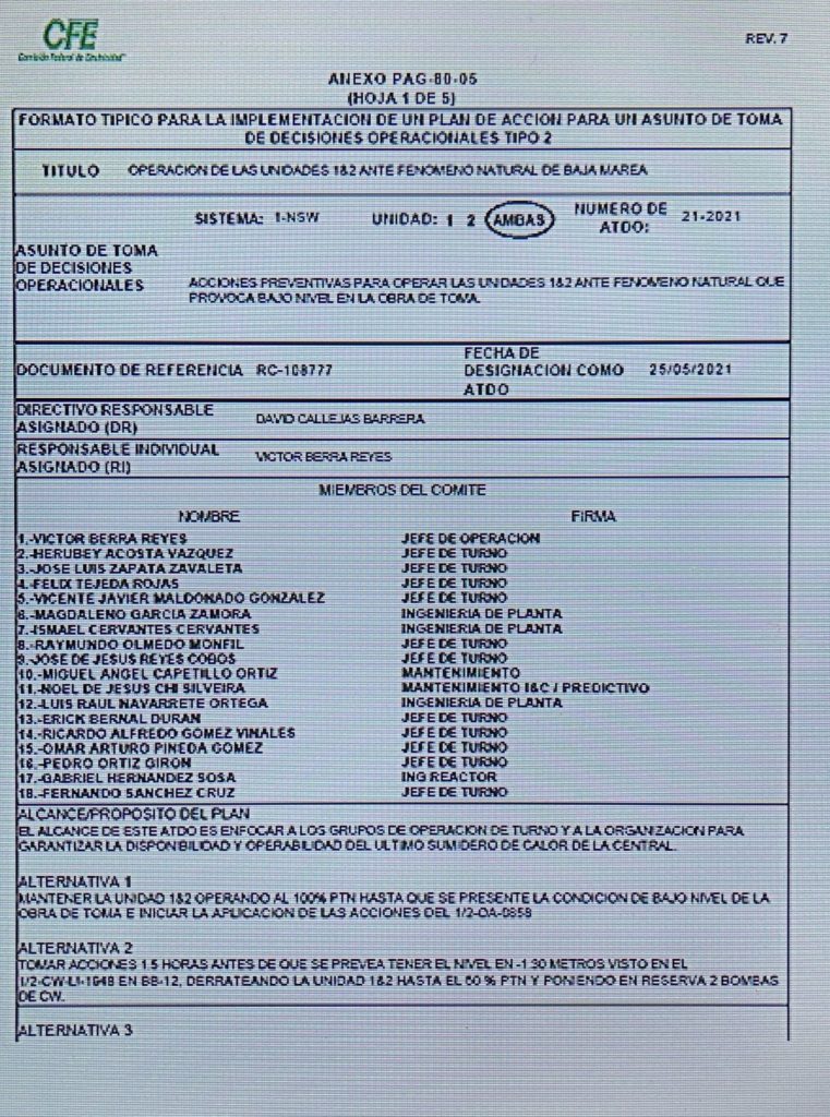 1.- “RC-108777 ATDO Tipo 2: Operación de las Unidades 1 y 2 ante fenómeno natural de baja marea”, puede leerse en este documento: “Condición Inadecuada/ Problema: Tomar acciones preventivas para operar las Unidades 1 y 2 ante fenómeno natural que provoca bajo nivel en la Obra de Toma.”