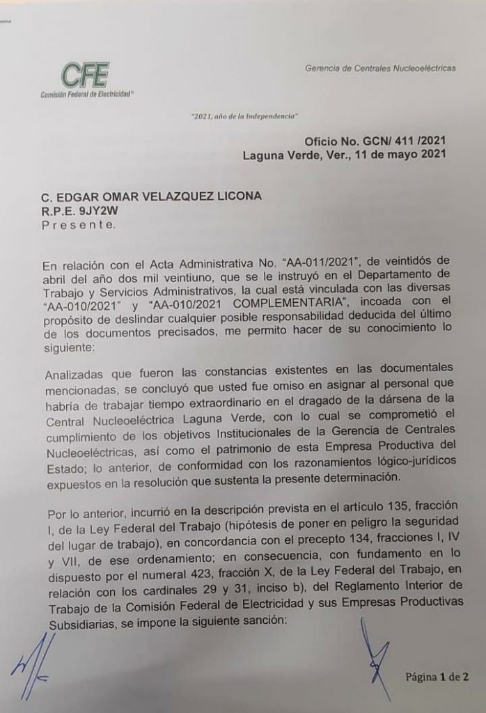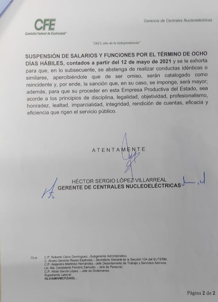 El Ing. Héctor Sergio López Villarreal, no atendió todas estas recomendaciones y requerimientos, plasmados en estos 3 documentos y ahora enfrenta la disyuntiva de tener que apagar los reactores o poner en riesgo la vida de los veracruzanos. López Villarreal, siguiendo con su tradición irresponsable, en lugar de aceptar su culpabilidad, prefirió descargar su enojo contra un trabajador sindicalizado, al que suspendió sin goce de sueldo durante una semana. El presidente AMLO debe despedir inmediatamente a López Villarreal, al igual que a Manuel Bartlett y Rocío Nahle.