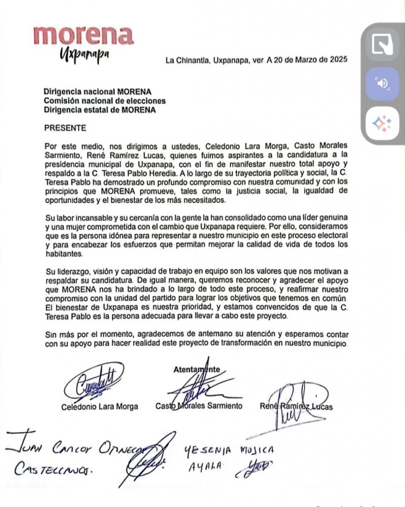 En entrevista, la aspirante morenista expresó que aprovecharon la visita a la dirigente nacional y a los integrantes del Consejo de Honor y Justicia y de la Comisión Nacional de Elecciones para entregarle un escrito, exigiéndoles que la elección del candidato o candidata sea apegada a los estatutos de Morena, en donde también le patentizaron que cinco de los siete precandidatos apoyan su postulación a la candidatura a la presidencia municipal de Uxpanapa.