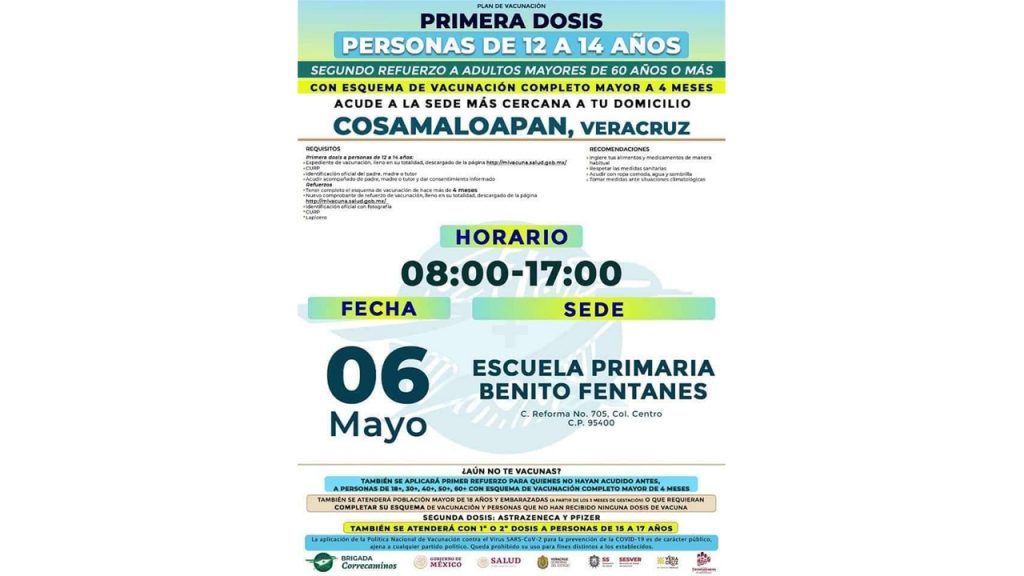 La primera dosis de vacunación se aplicará con el biológico por el sector salud de la entidad veracruzana en la escuela primaria Benito Fentanes de 08:00 a 17:00 horas, con los requisitos habituales, y con la posibilidad de aplicarse unidosis, segunda dosis o refuerzo a quien le falte, con el apoyo logístico de personal de Protección Civil, Atención Medica de Urgencias y Salud Municipal.