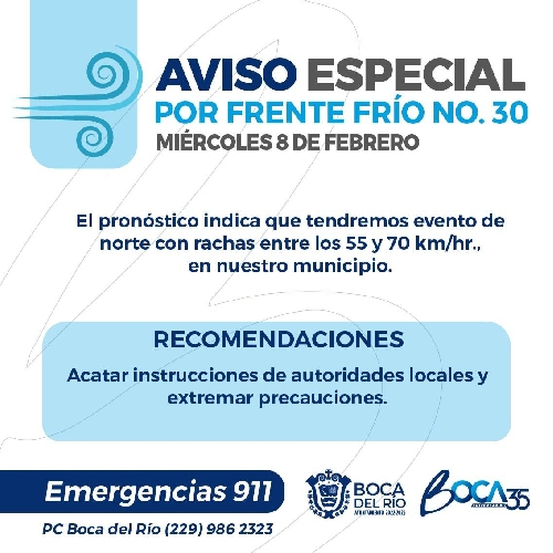 Por ello se ha replicado el aviso especial emitido por la secretaría de Protección Civil estatal por el Frente Frío 30, el cual generará condiciones de evento de norte con rachas de viento entre los 55 y 75 kilómetros por hora, emitiéndose las recomendaciones desde este martes.