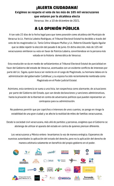 A través de un comunicado dirigido a la opinión pública, señalan que a tan solo 22 días de la fecha legal para que tome posesión, el Tribunal Electoral Estatal ha decidido, a través del voto de los magistrados Tania Celina Vásquez Muñoz y Roberto Eduardo Sigala Aguilar, que se debe repetir la elección, cuando en dicha elección más de 105 mil veracruzanos ya emitieron su voto en favor de Patricia Lobeira, convirtiéndola en la persona más votada en la historia democrática de Veracruz.