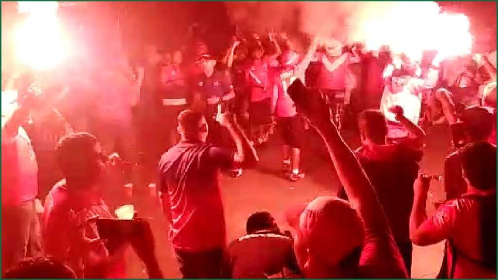 Aficionados y porras que integran la Barra del Pirata, festejan el 79 aniversario del equipo Tiburones Rojos del Veracruz en la explanada del estadio Luis Pirata Fuente.
