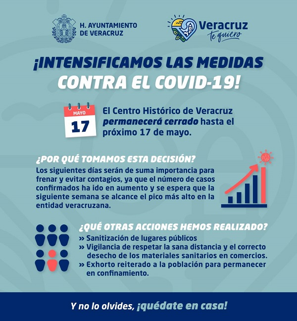Veracruz, Ver.- El H. Ayuntamiento de Veracruz informa que el centro histórico de la ciudad permanecerá cerrado hasta el próximo domingo 17 de mayo, como un esfuerzo adicional para reforzar las medidas sanitarias que se han establecido en el municipio.