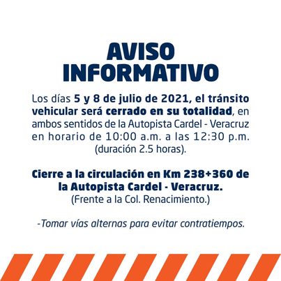 El Ayuntamiento de Veracruz anunció que habrá cierre vial en su totalidad en ambos sentidos en la autopista Cardel-Veracruz los días 5 y 8 de julio en un horario de 10 de la mañana a 12:30 del mediodía.