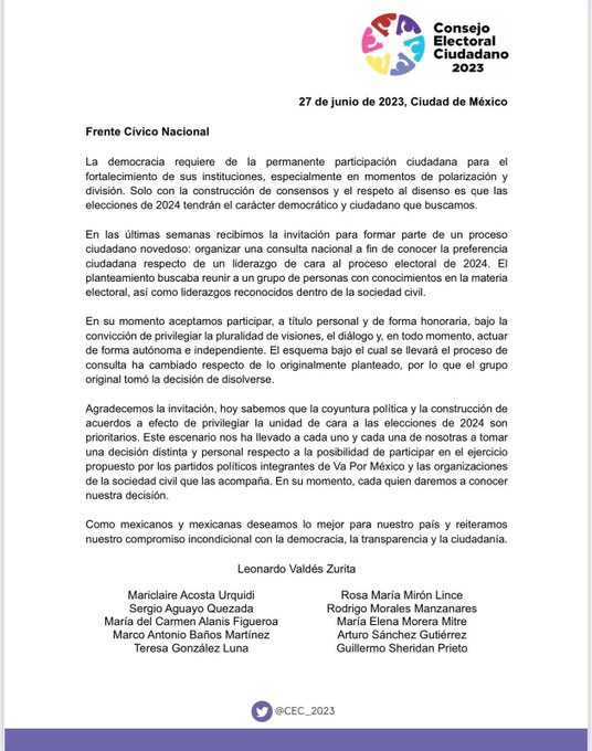 En una carta que publicaron en sus redes sociales, los integrantes de este Consejo explicaron que en la últimas semanas fueron invitados para formar parte de un proceso ciudadano, que era organizar una consulta nacional para conocer la preferencia sobre el liderazgo que encabezará la candidatura presidencial de 2024 de la oposición.