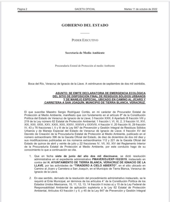 Veracruz, Ver.- La Procuraduría Estatal de Protección al Medio Ambiente, declaró emergencia ecológica por el daño ambiental que provocó la empresa Comercializadora Bertocal del Sur S.R.L. de C.V., en el sitio ubicado en camino al Jícaro y carretera a San Joaquín en el Municipio de Tierra Blanca, la cual fue contratada en 2018 por el ex alcalde Patricio Aguirre Solís, para la prestación, por diez años, del servicio público de recolección, traslado y disposición final de los residuos sólidos municipales.