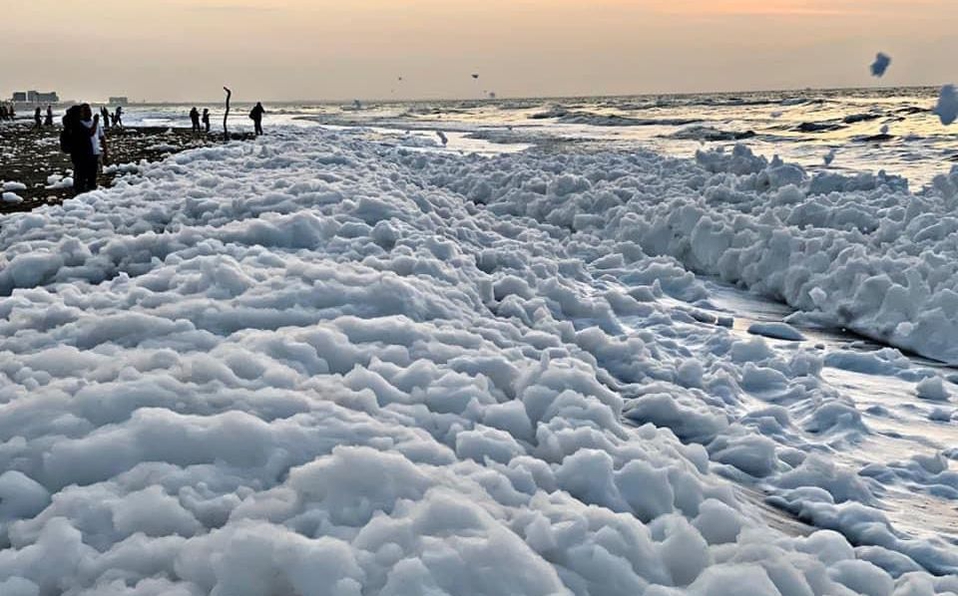 Los vientos que se registraban llevaron la espuma casi a orillas del malecón costero de la ciudad.