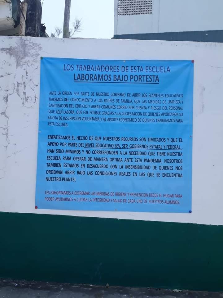 Los maestros de la escuela secundaria José Azueta colocaron una lona diciendo que trabajaban bajo protesta porque el plantel está muy deteriorado y si no se le da mantenimiento puede caerse el edificio en pedazos.