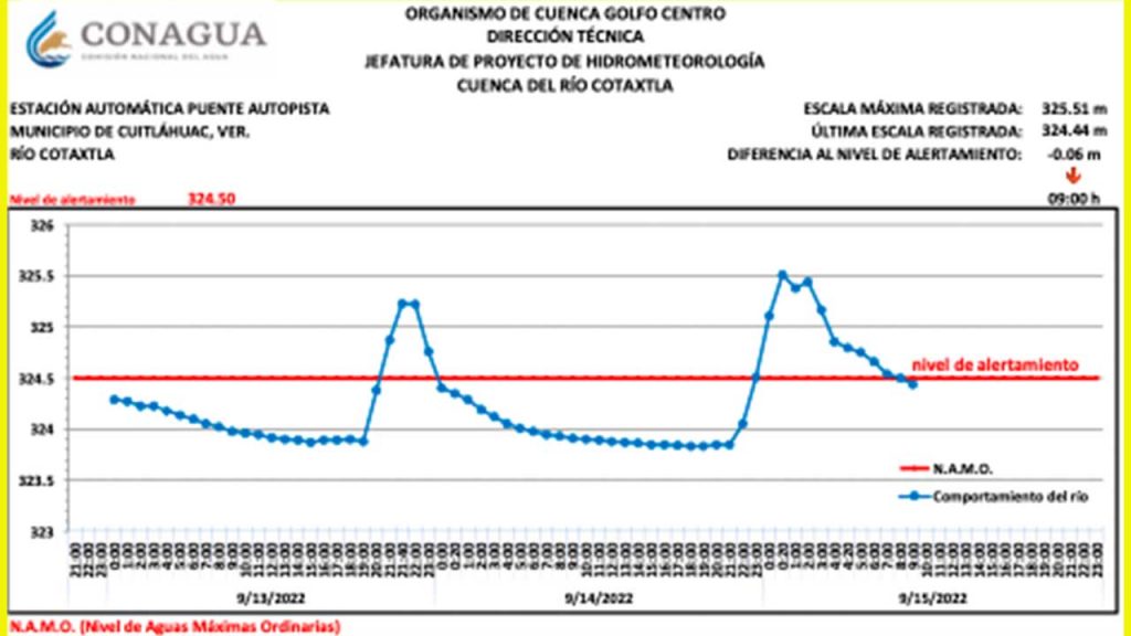 La estación automática Puente de la Autopista (Cuitláhuac, Veracruz) ha superado su nivel de alertamiento para las localidades aguas abajo:
