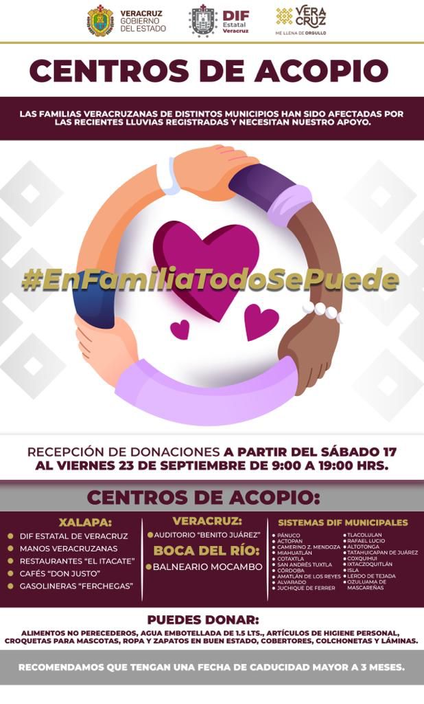 Xalapa, Ver., 18/09/22.- El Gobierno de Veracruz, a través del DIF estatal, invita a la ciudadanía a los diversos centros de acopio abiertos desde este fin de semana y hasta el viernes 23 de septiembre para apoyar a las familias veracruzanas afectadas por las recientes lluvias en municipios de todo el estado.