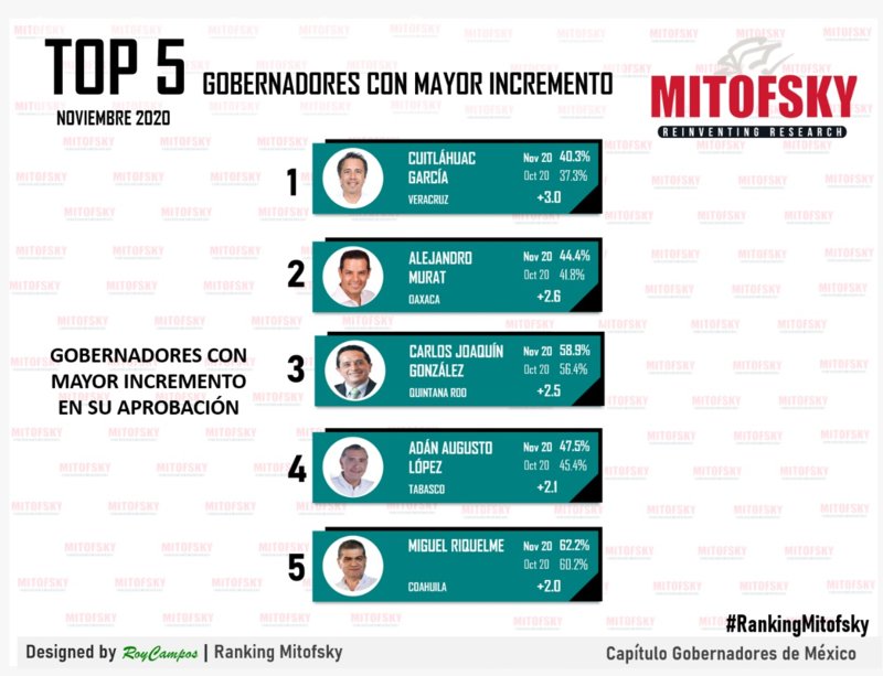 Por lo anterior, se coloca como el mandatario estatal con mayor aumento de aprobación para ese periodo, seguido por su homólogo de Oaxaca, Alejandro Murat, quien aumentó de 41.8 a 44.4 por ciento de octubre a noviembre.