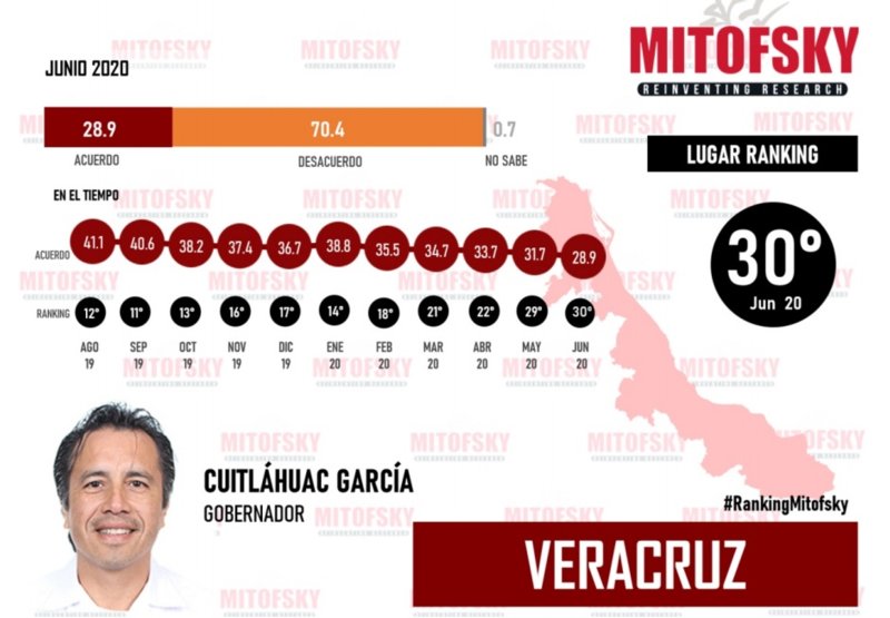 Los resultados de una encuesta realizada por Mitofsky muestran que el gobernador de Veracruz, Cuitláhuac García Jiménez registra una baja aprobación, de acuerdo con datos correspondientes al mes de junio del 2020.