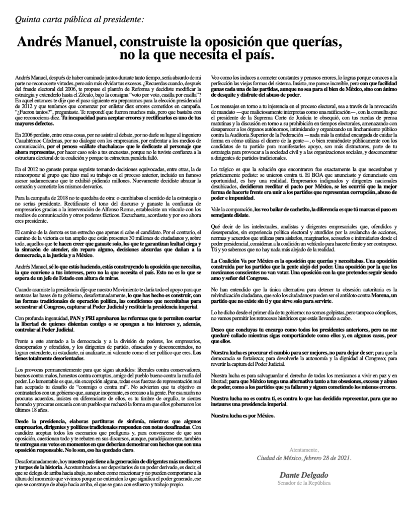 “La Coalición Va por México es la oposición que querías y necesitabas. Una oposición construida por los partidos que la gente alejó del poder. Una oposición por la que los mexicanos conscientes no van votar. Una oposición con la que pretendes seguir siendo amo y señor del Congreso”, se lee en el documento.
